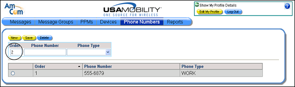 2. In the Order field, enter an order number for the phone number. The order number determines the order in which the phone numbers are displayed in the screen. Entering an order number is optional. Order numbers do not have to be unique. Phone numbers without order numbers display at the top of the list in the ordered they were created.