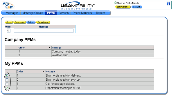 The order of the PPMs in the list determines the order in which they display when creating messages. The user PPMs can be re-ordered in the PPM screen by swapping the order of two PPMs.