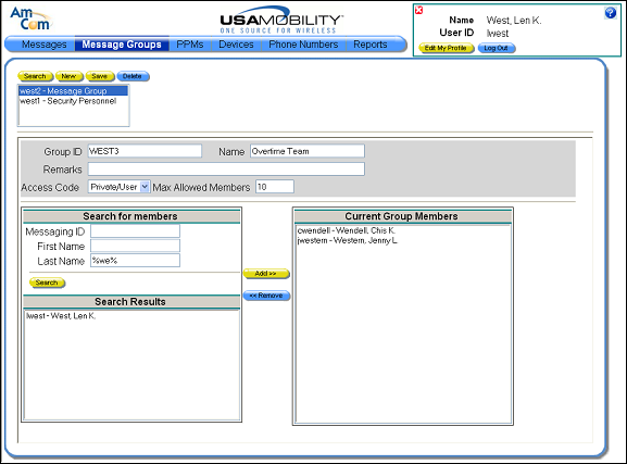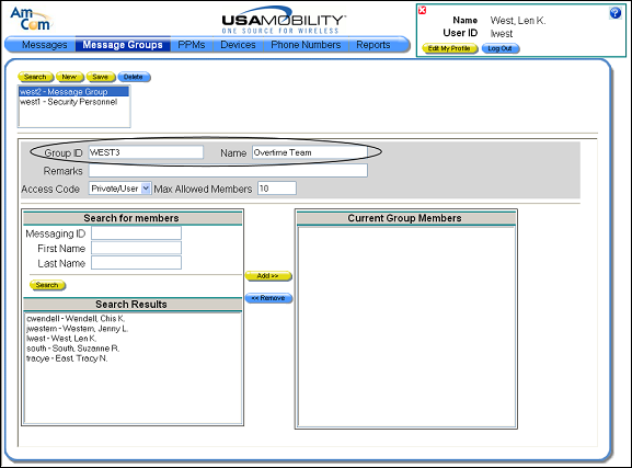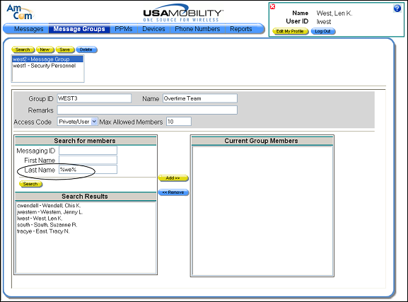 7. Add members to the group. The people that can be added to a message group display in the Search Results window. Choose a person from the list, and then click the Add button. The select person displays in the Current Group Members window.