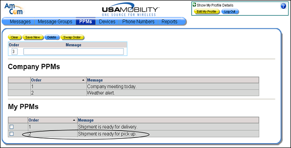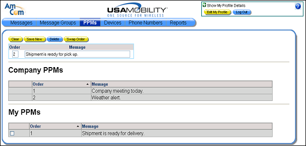 1. Select the PPMs option from the menu bar. The PPM screen displays. The company PPMs and user PPMs display in separate sections in the screen.