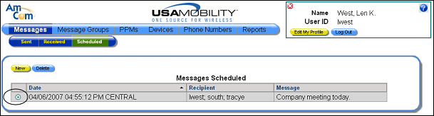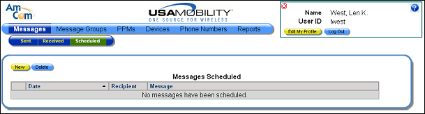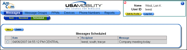 1. Select the Scheduled option from the Messages option in the menu bar. The Scheduled screen displays a list of scheduled messages.