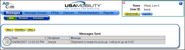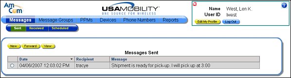 1. Select either the Sent or the Received option from the Messages option in the menu bar. The Sent or Received screen displays.