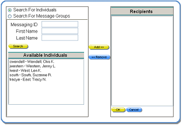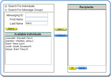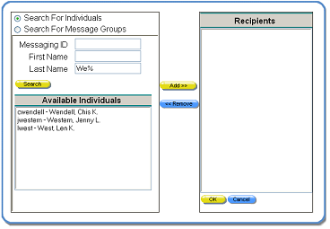 e. Click the Add button to include the selected person in the list of recipients. The person’s name is removed from the Available Individuals window and placed in the Recipients window.
