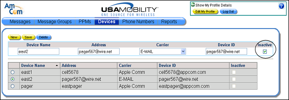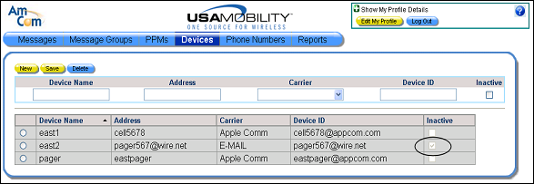 4. Click the Save button to save the change. The Inactive option is selected for the device in the list of devices.