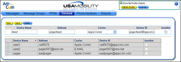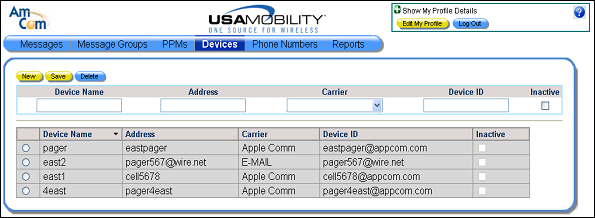1. Select the Devices option from the menu bar. The Devices screen displays.