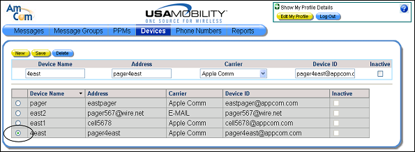 2. Click in the radio button in the row for the device that should be deleted. Only one device can be selected at a time. Information for the selected device displays in the device information fields.