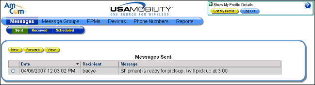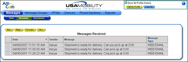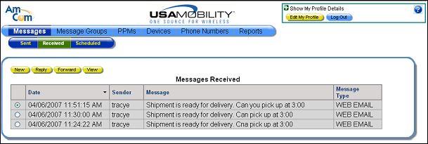 1. Select the Received option from the Messages option in the menu bar. The Received screen displays.