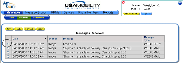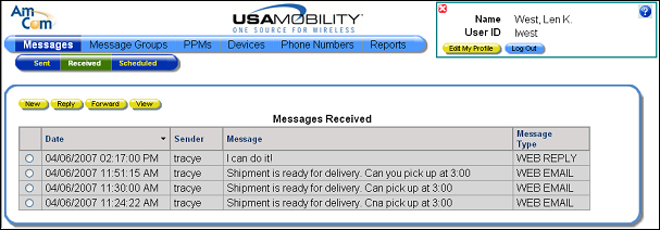 1. Select the Received option from the Messages option in the menu bar. The Received screen displays a list of received messages.
